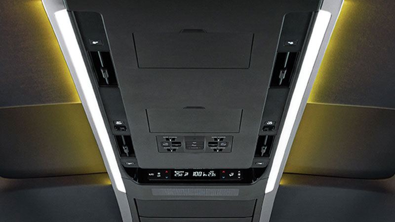Dải đèn trần xe kéo dài chiếu sáng toàn bộ khoang cabin, ngoài ra khách hàng có thể lựa chọn chế độ đèn chiếu sáng cá nhân mang lại tiện nghi riêng biệt cho các vị trí ngồi. Đèn trang trí trần xe trang bị 14 màu cơ bản cùng 50 màu mở rộng để Khách hàng tùy chọn theo sở thích.