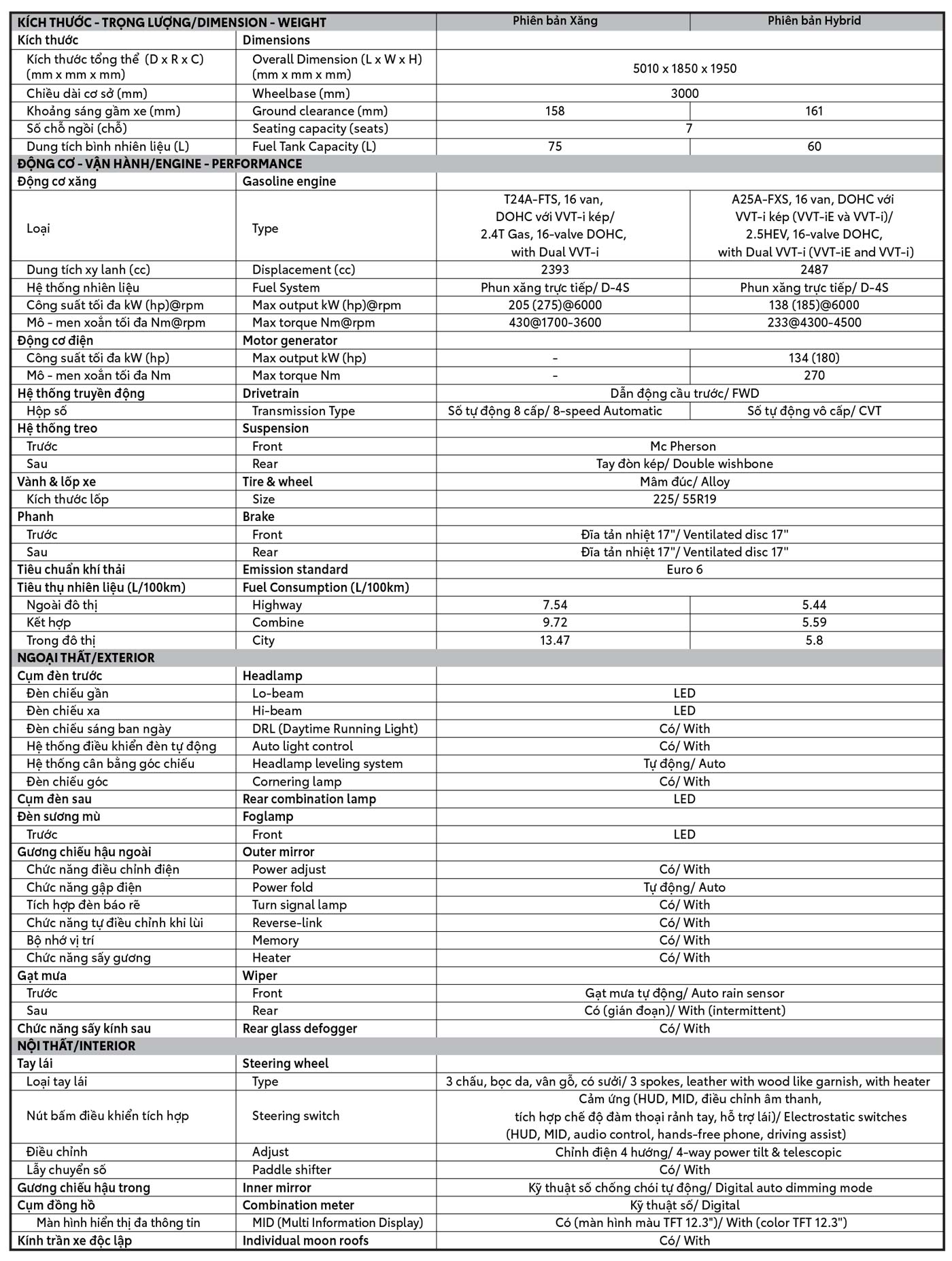 Phiên bản máy xăng được trang bị động cơ 2.4L Turbo mã T24A-FTS kết hợp cùng hộp số tự động 8 cấp mang lại khả năng vận hành mạnh mẽ đồng thời tiết kiệm nhiên liệu.