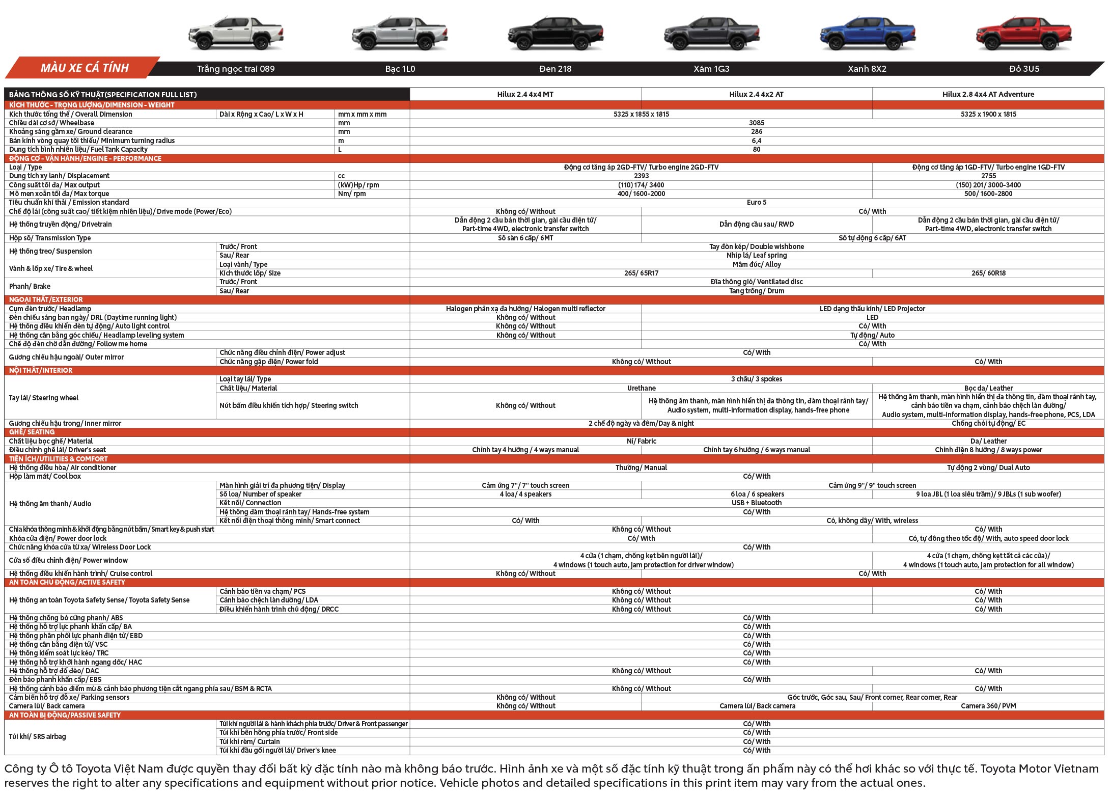 • Hilux 2.8L 4×4 AT Adventure: 999.000.000 VNĐ